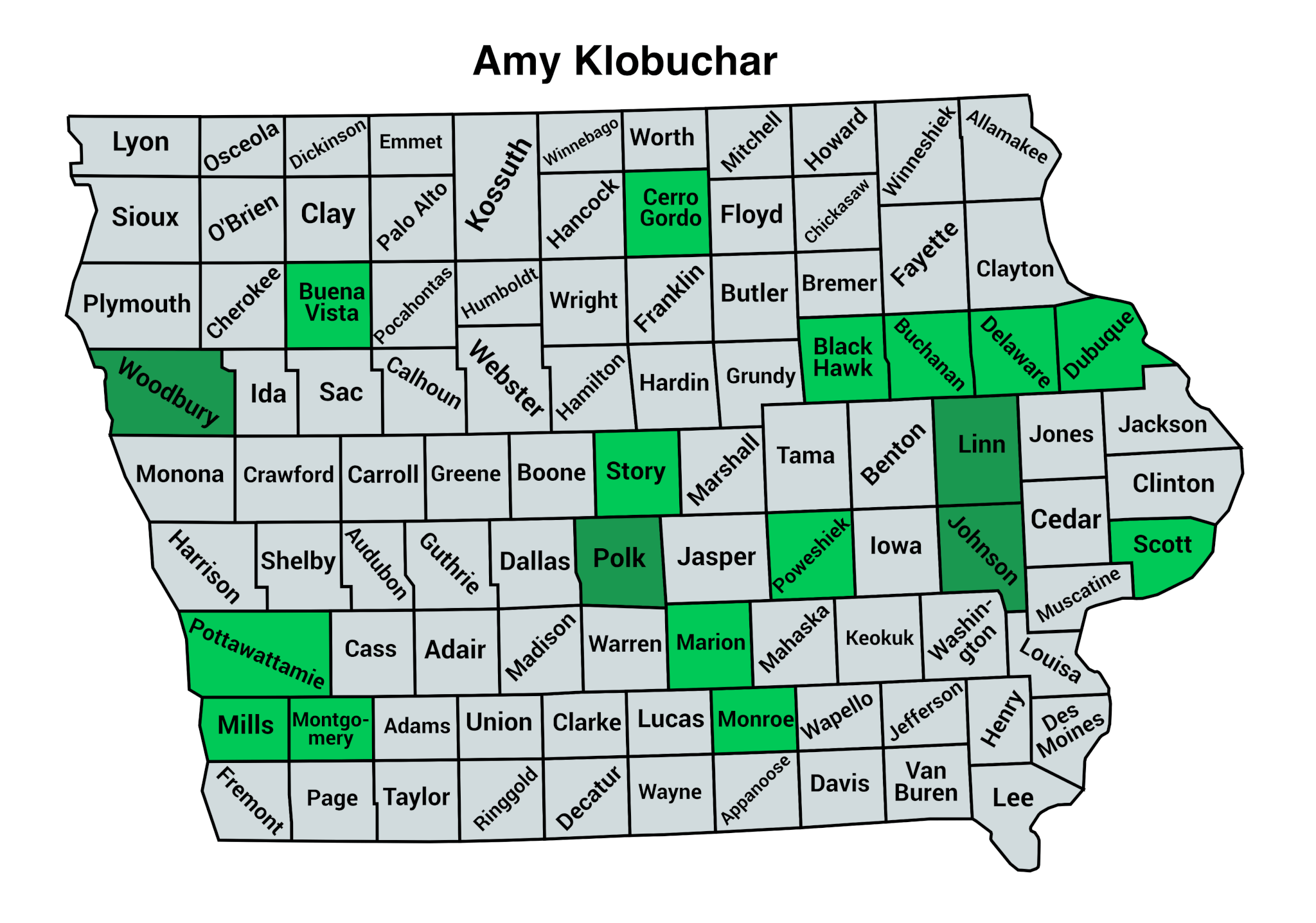 Klobuchar is a frequent visitor to Iowa. Many of her trips are only for one or two days, but being within easy driving distance means she can hop in and out more often for local Democratic events and trips. She too visited Southwest Iowa to see the aftermath of the flooding. Klobuchar has also begun to focus in on some rural counties, where her experience on the Agriculture Committee gives her some extra talking points.