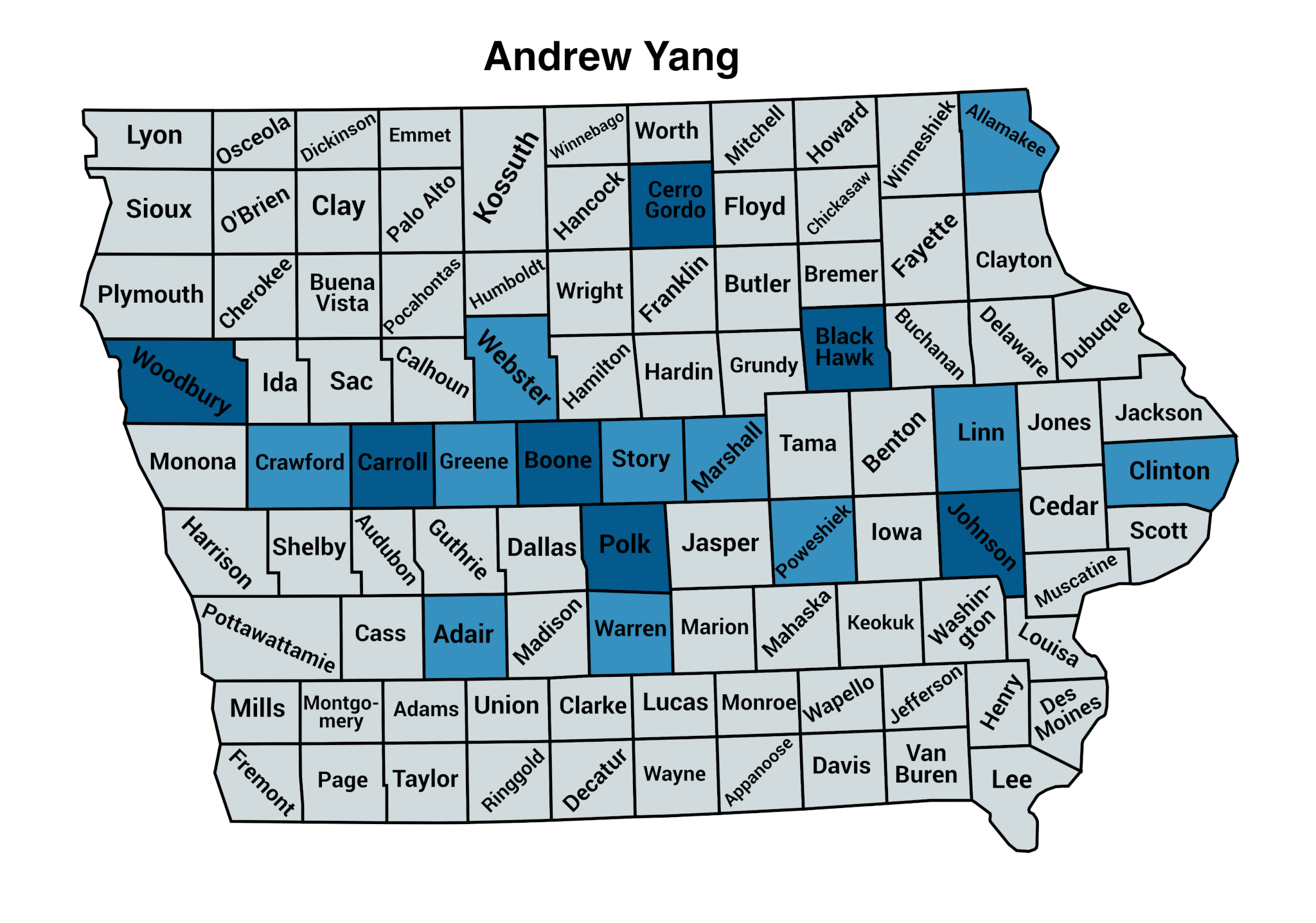 Yang has done a good deal of travel throughout Iowa, both last year and this. Now that he’s caught fire online, he’s holding larger rallies in big cities across the country, but he’s still making sure to visit early states often. When Yang visits Iowa, it’s usually for longer trips with a variety of types of events, from town halls to policy round tables to ride-alongs with truckers. Like a surprising number of candidates have, Yang has hit up a lot of Western Iowa counties. He’s also the only one to visit Allamakee County this year.