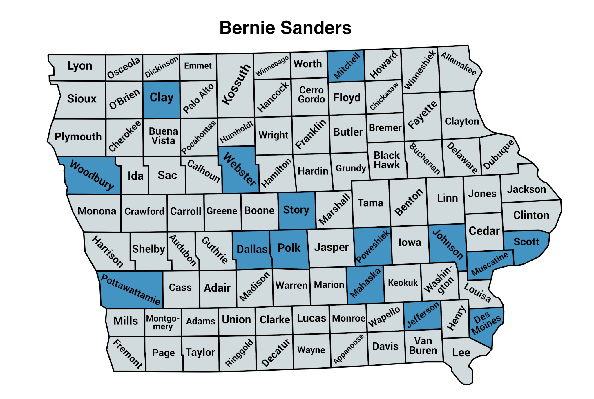 Interestingly, Sanders has yet to hold multiple events in any county (unless you count his unscheduled tour of the Des Moines Farmers Market). Most of his events are structured speeches from the podium that draw in Sanders fans from a wide radius, so he hasn’t been doing as many small house parties or one-off policy events like many of the other candidates.