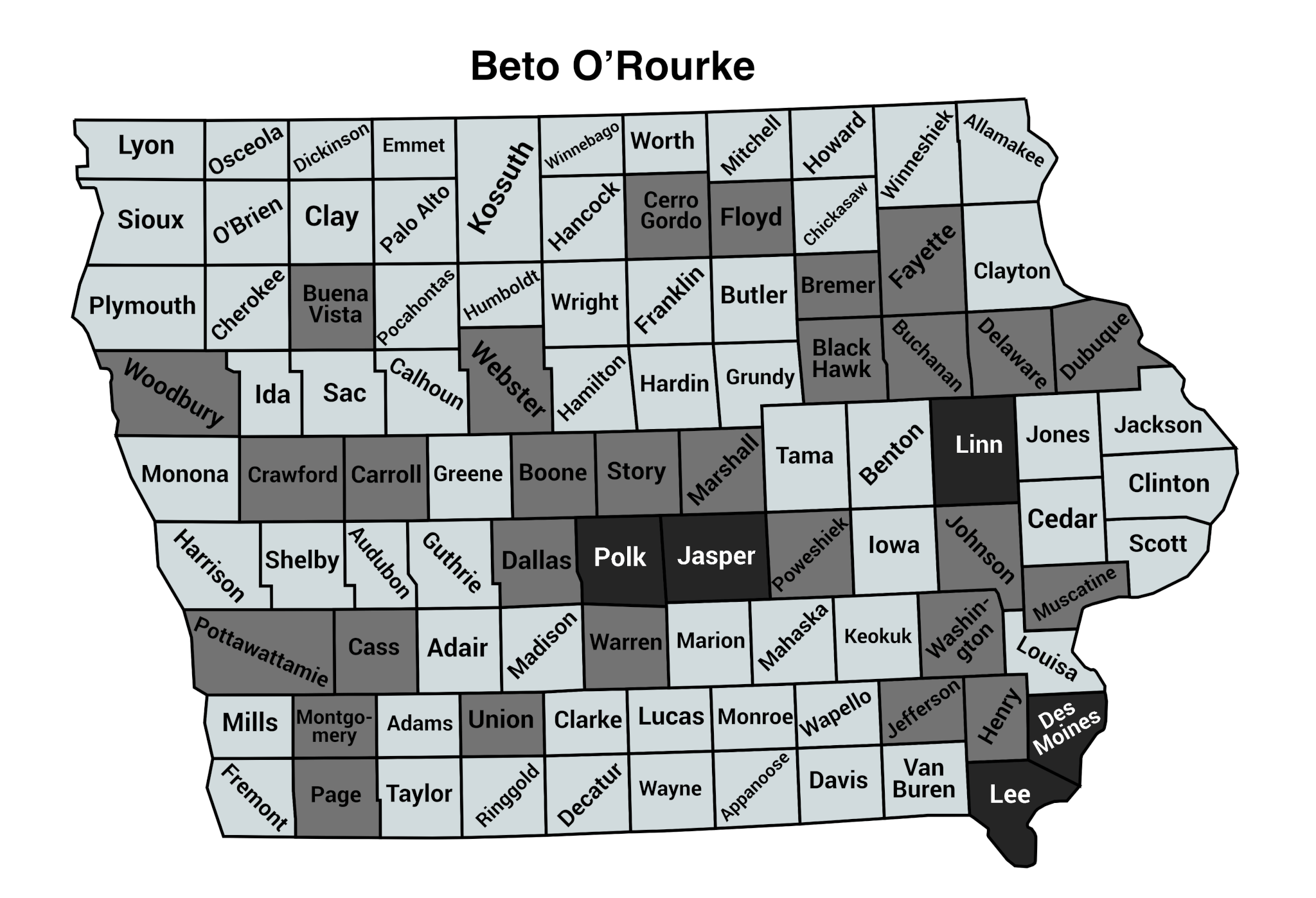 While O’Rourke has only made three trips to Iowa in 2019, each one has been an endurance test that racks up as many stops as possible, lasting four or five days. Such is the benefit of not having a formal day job. O’Rourke’s barnstorming of the state (usually with him at the wheel) has already brought him to over a third of Iowa’s 99 counties. If he decides to do a full 99-county tour, he may be the second to get there after Delaney. O’Rourke has already done multiple stops within these initial counties, including one day where he held six separate Polk County events.