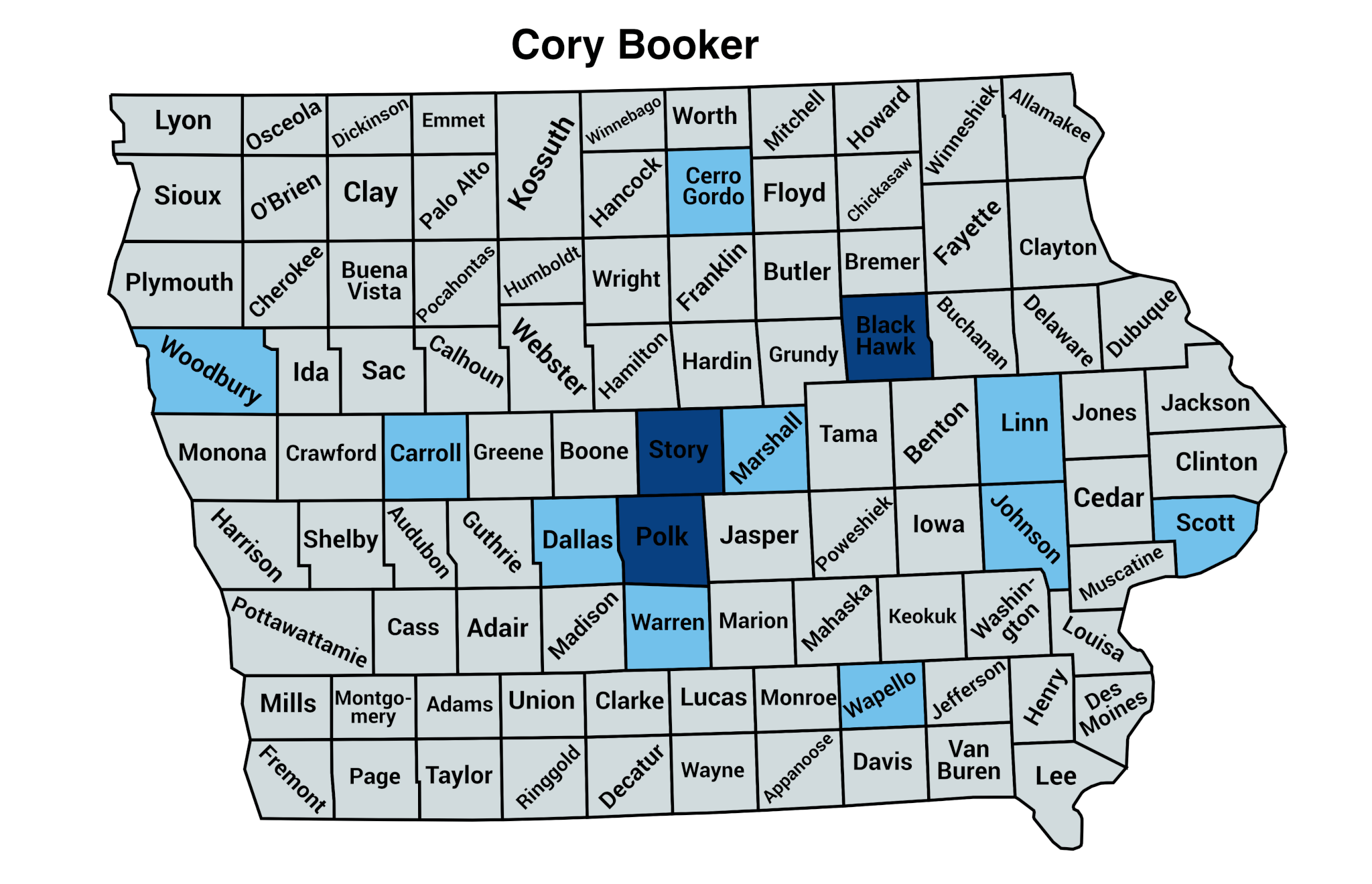 Booker appears to be working his way through all the top-population counties in the state before doing region-specific tours. He’s found large crowds along the way, mixing his event formats between town halls, rallies, and panel discussions. As will be the case with many of these maps, Black Hawk County got multiple visits thanks to the special election that several candidates helped out with in March.