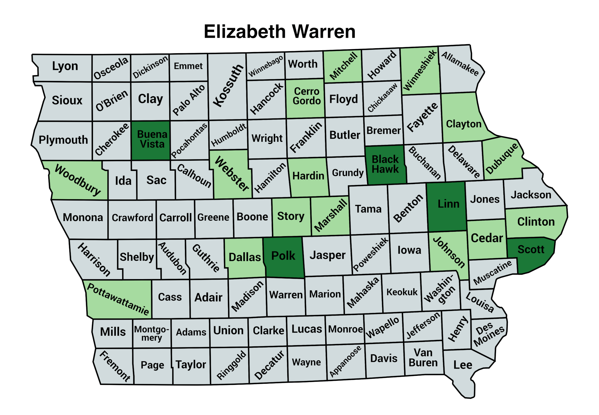Being the first major candidate to announce gave Warren some extra time to travel to Iowa this year. She’s been back often, usually holding large, well-attended town halls across the state. Warren has a large field team, which helps build for events in some more difficult rural counties like Clayton, Hardin, and Mitchell. She’s also one of the few candidates to campaign in Northeast Iowa early on.