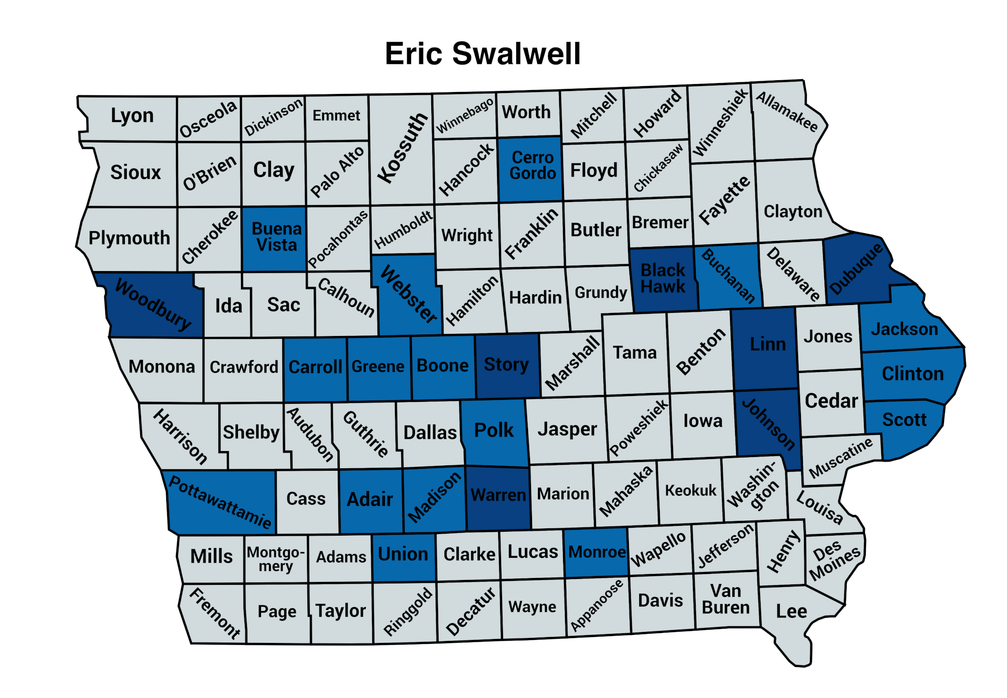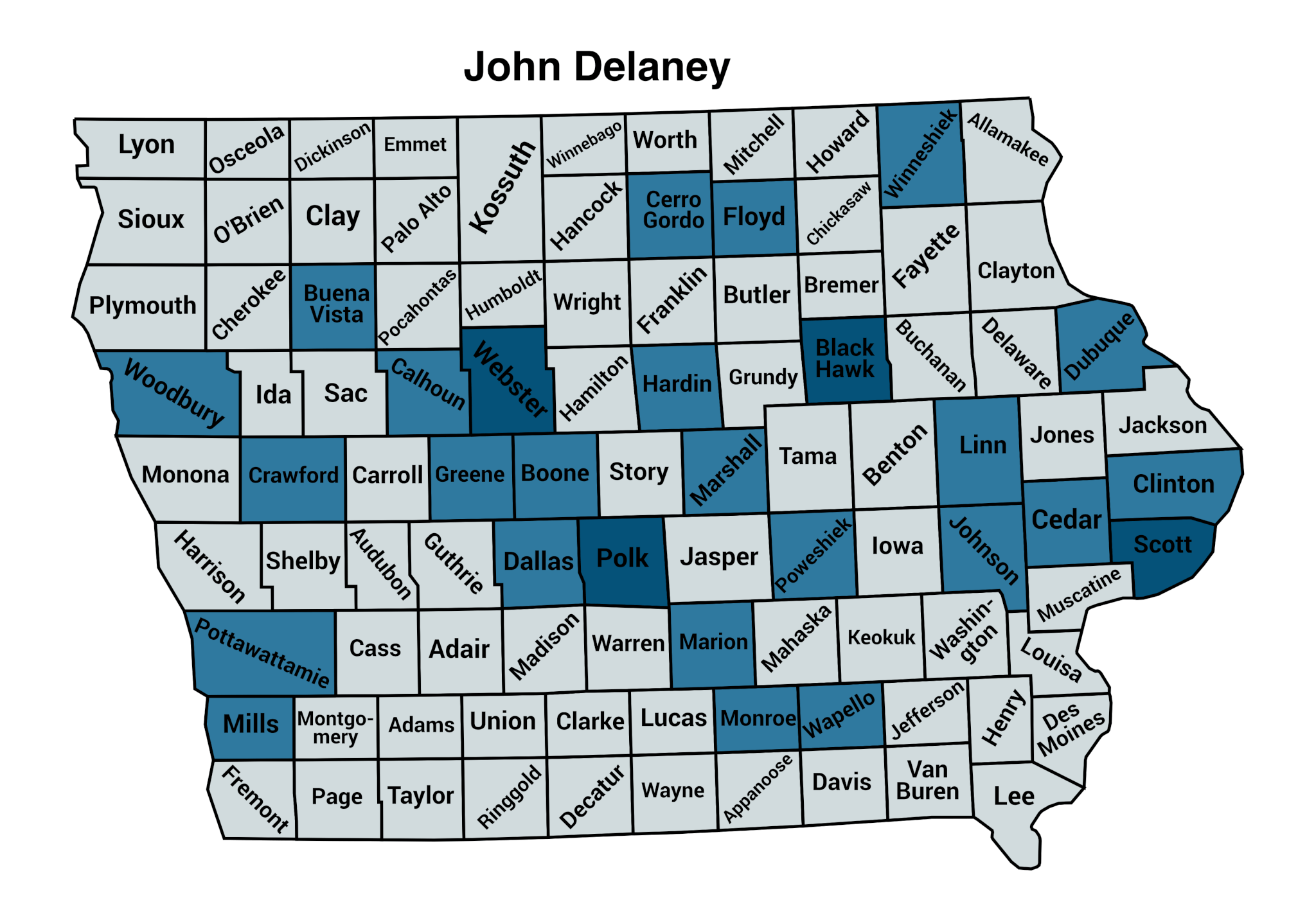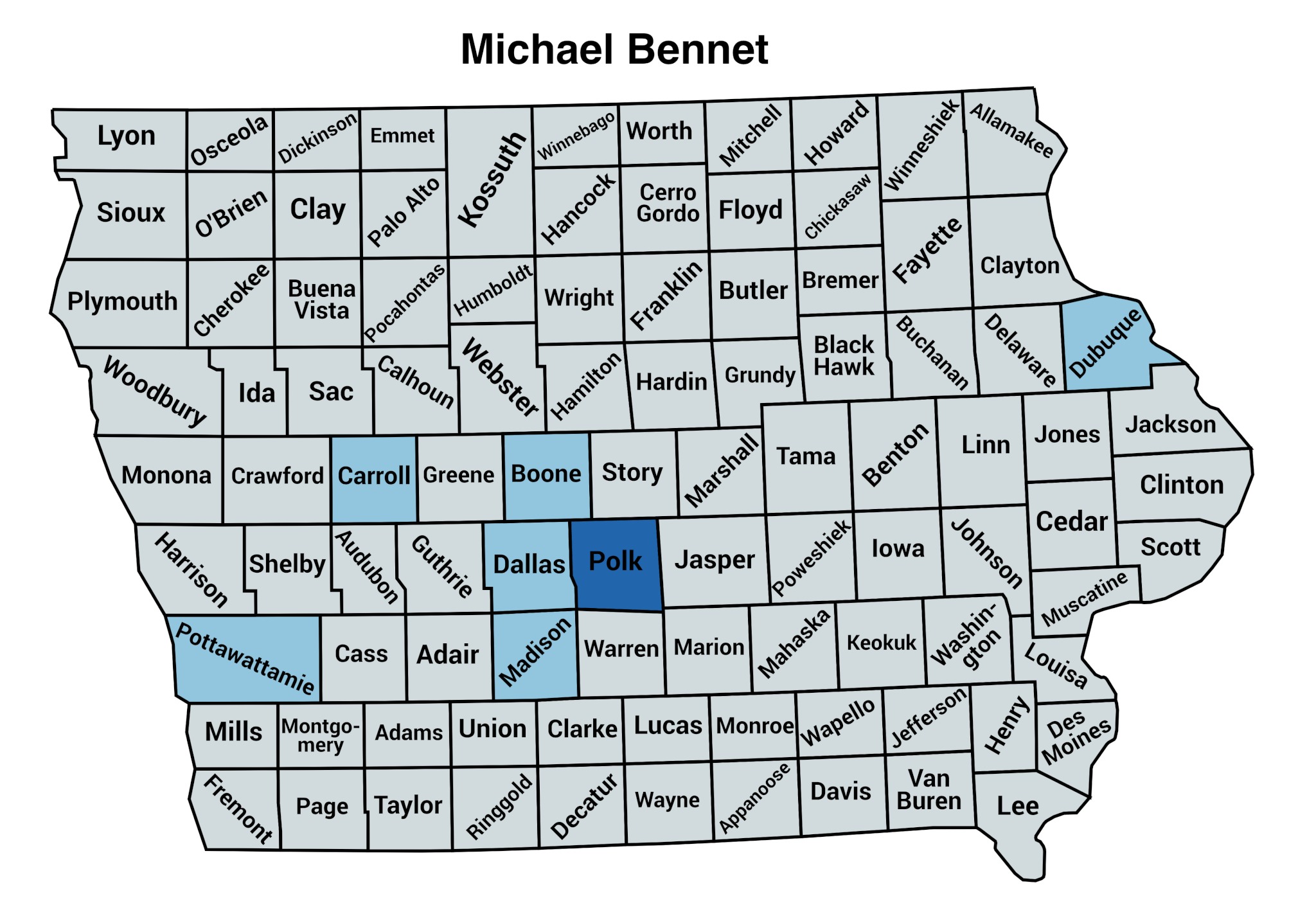 The latest candidate to enter the race, Colorado’s Bennet has only done a few short trips to Iowa so far. His surgery last month kept him off the campaign trail for a while and delayed a launch, but Bennet did make a three-day trip back in February when he first started considering a run. He’s kept mostly to Central Iowa, doing four events in Polk County alone. Bennet visited Carroll County before some of the biggest Eastern Iowa cities. As you’ll see in these maps, certain counties with strong Democratic organizations (like Carroll’s) attract candidates who have little early infrastructure because the local party can easily turn out a crowd.