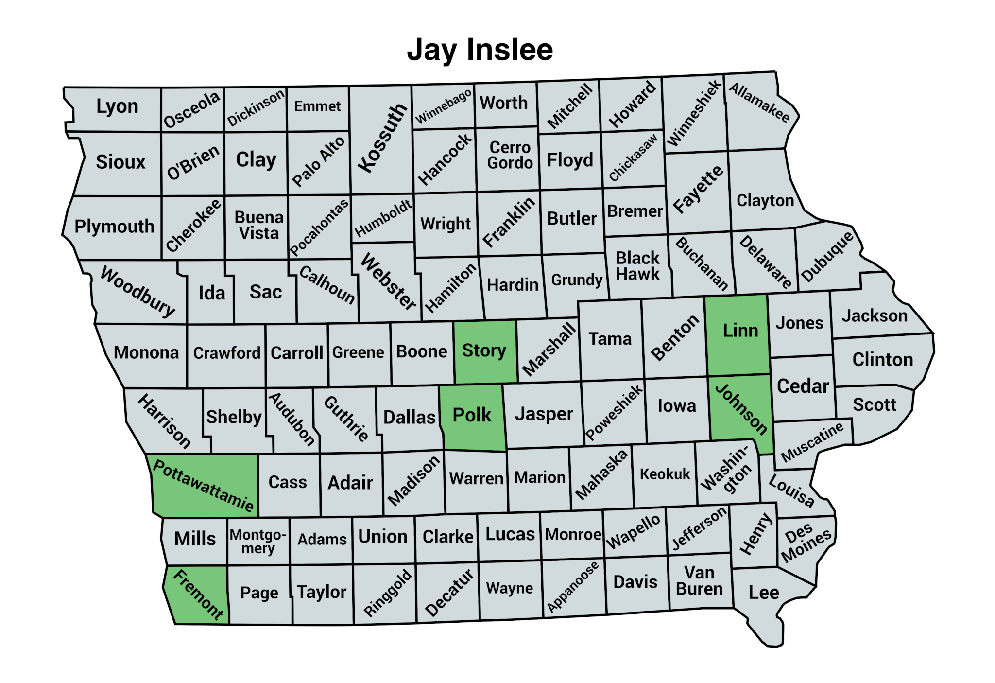 Both of Inslee’s Iowa trips have been for just one day each this year; he appears to be another candidate who spent a lot of time early on in the race on fundraising. Inslee started off in the counties where there are large climate change activist networks. Inslee also toured the flooding in Southwest Iowa, which is why Mills and Fremont counties appear on a lot of candidates’ maps.