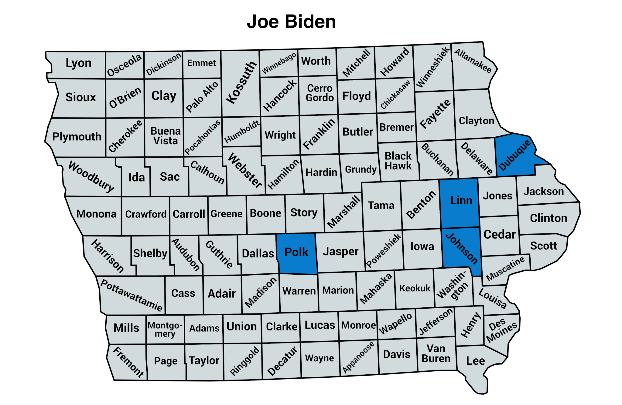 The former vice president’s county visit map looks exactly like how most major candidates plan out their initial trip: hit up the big three of Des Moines, Cedar Rapids, and Iowa City, and take in one other important Democratic county. Biden chose Dubuque, a place where he’s always enjoyed strong support from Catholic Democrats and union members. Scott County, the third-largest county in the state, often gets hit on candidates’ second trip to the state.