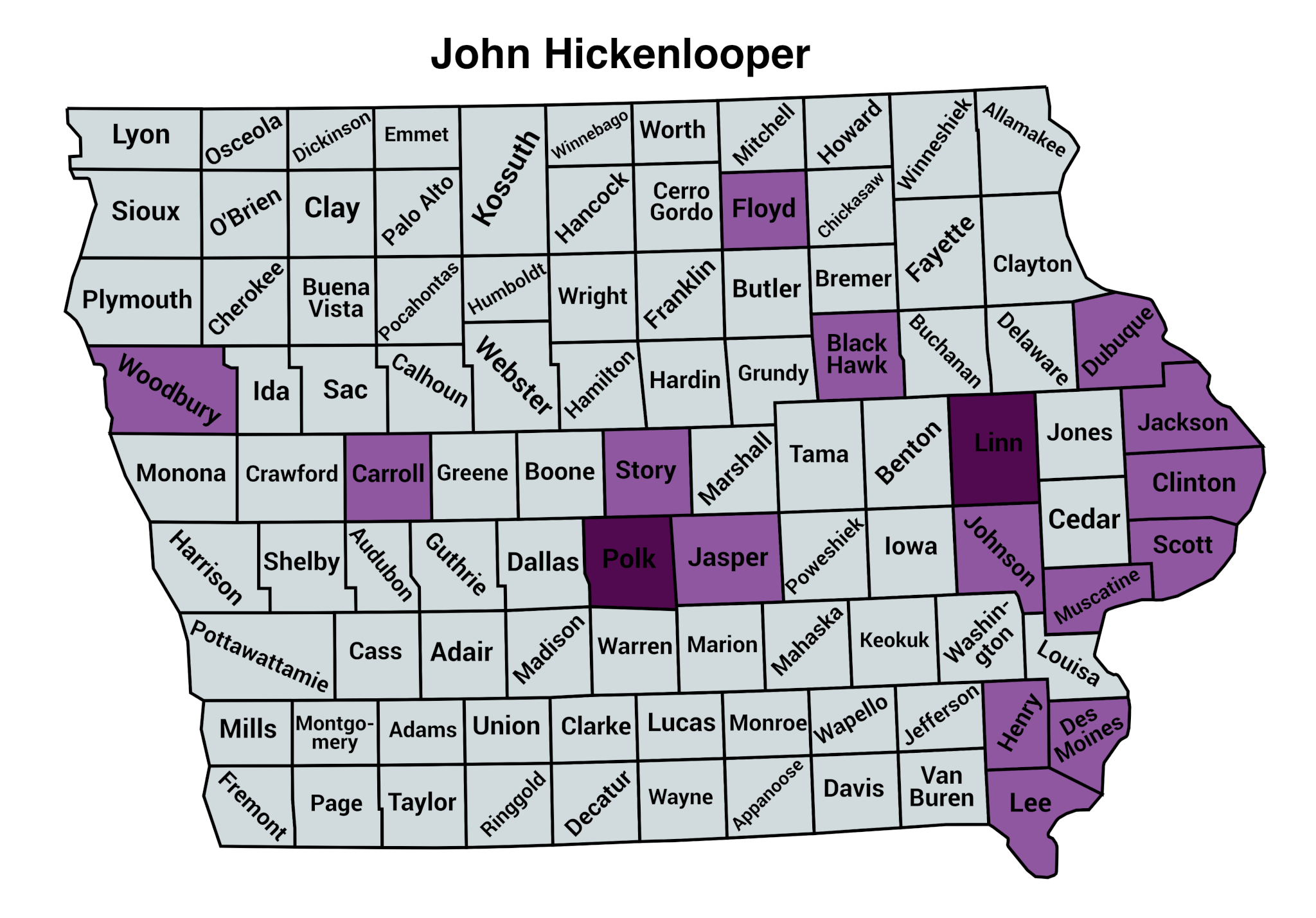 Hickenlooper’s visits have focused heavily on Iowa’s eastern seaboard, knocking out a lot of the blue-collar, union-heavy counties out there. He’ll also be one of the few that have visited Newton/Jasper County so far this year.