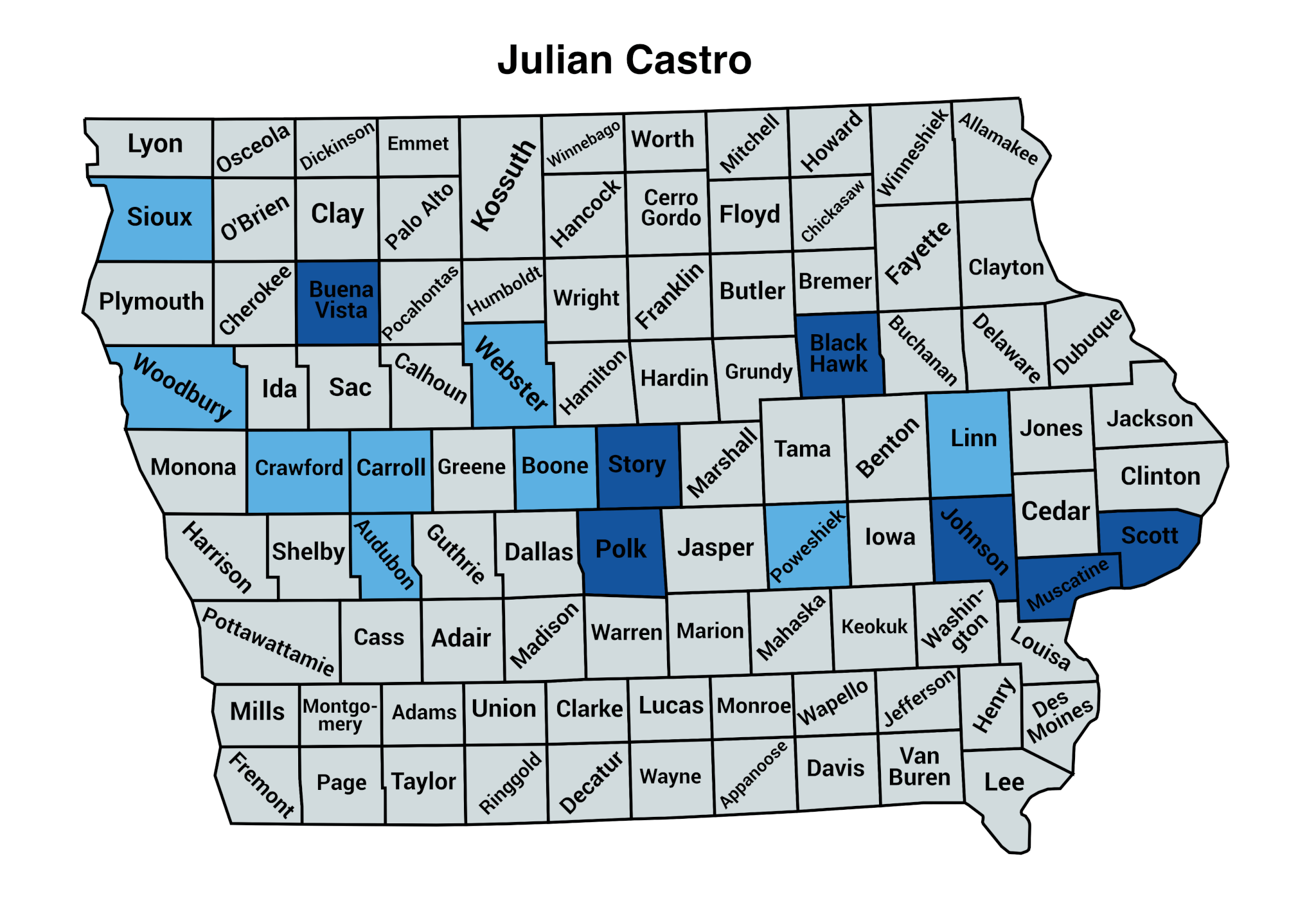 Castro has quietly racked up quiet a lot of county visits in Iowa this year, including multiple appearances in seven counties, the most of any candidate this year. He’s also taking a very targeted approach in Iowa, making several trips out to Western Iowa. Castro has visited counties with large Hispanic communities and small counties where the precincts and caucus math make it easier to hit viability (like Audubon County). This past week, Castro did a college campus tour.