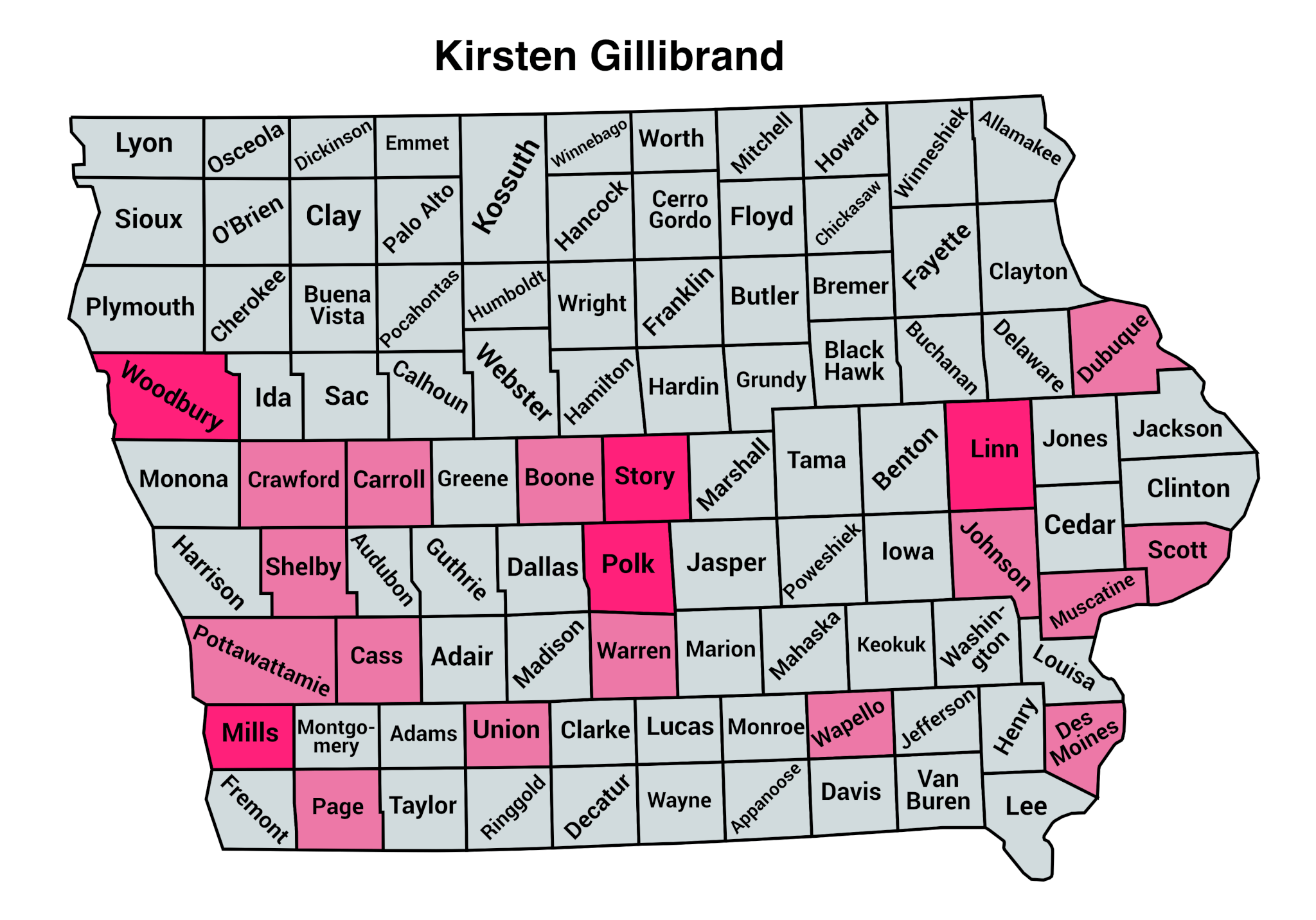 Gillibrand has notched a lot of county visits already this year, typically doing longer, multi-day swings when she comes out to Iowa. She’s done a couple of region-specific tours, visiting four Mississippi River counties in one trip and going through Southwest and Western Iowa in another. She touts on the campaign trail that she’s won in rural and blue-collar areas in New York, and much of her Iowa travel schedule has focused on similar counties here.