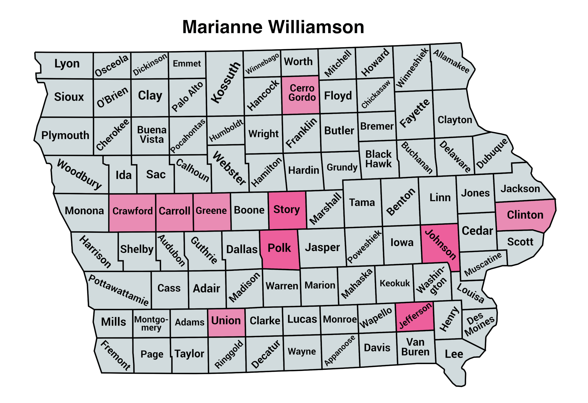 Like Gabbard, Williamson has frequented counties that prefer their outsider candidates, and she’s already done three events in Fairfield. She’s also spent significant time in the Des Moines metro (where she now has an apartment), holding many house parties there before getting out to some mainstays like Cedar Rapids and Davenport.