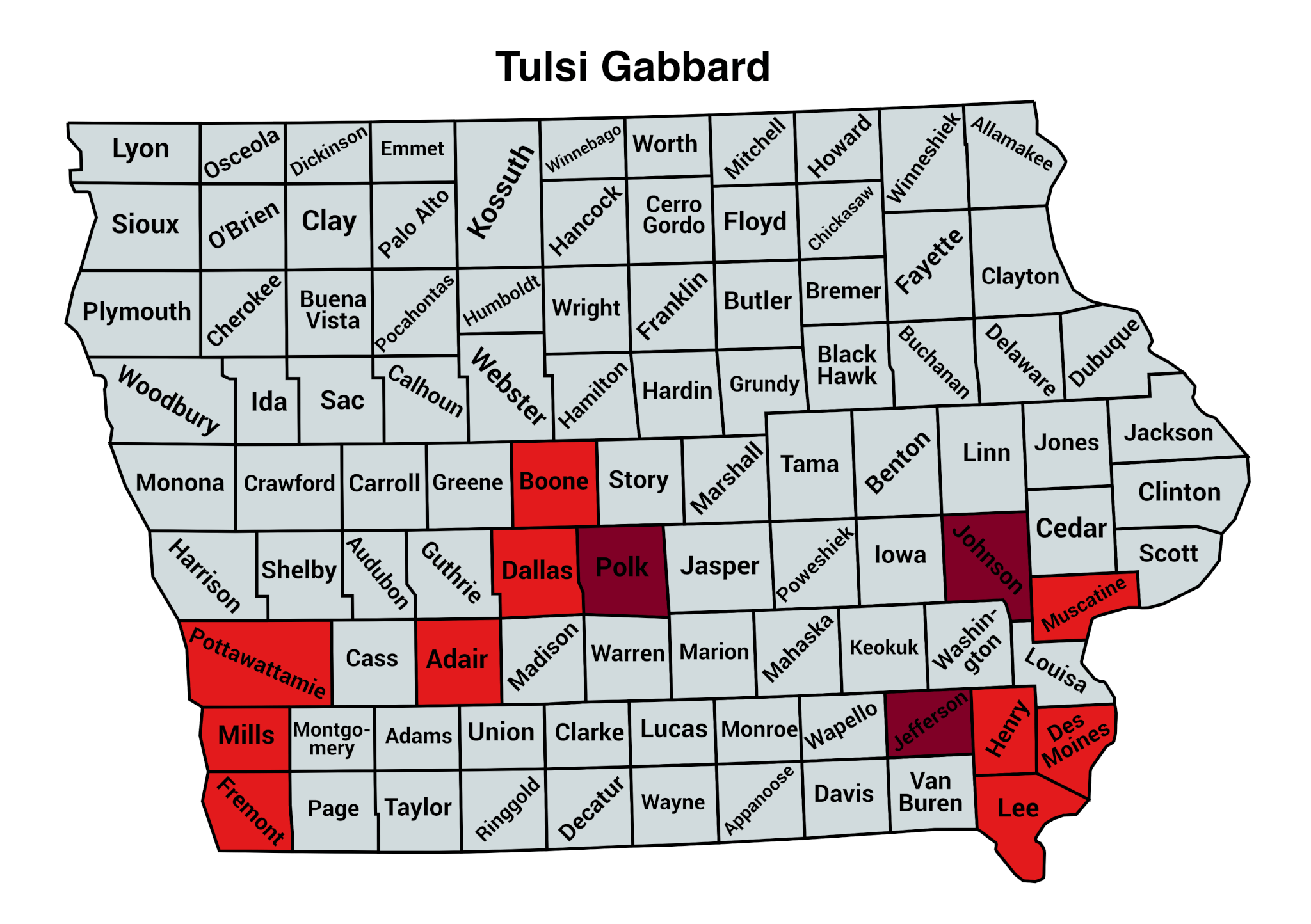 Gabbard’s initial trips out to Iowa stuck mostly to the counties that like to reward progressive or outsider candidates. She’s made a significant amount of stops in Iowa City and Fairfield before hitting up Cedar Rapids or Davenport, holding five events in Iowa City already. She’s since started to branch out, doing a Southeast Iowa swing in April.
