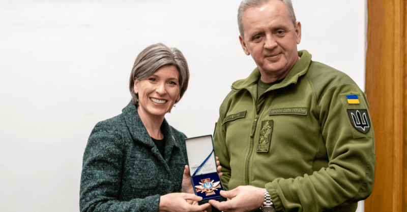 Photo: Joni Ernst meets the Commander-In-Chief of the Armed Forces of Ukraine during her trip to Ukraine in February. Photo via U.S. Embassy Kyiv.