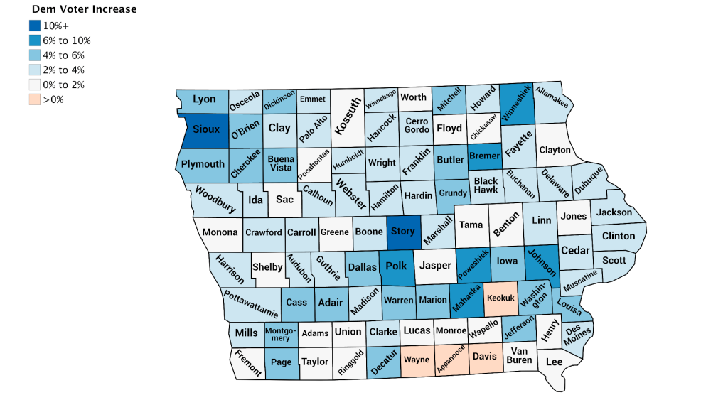 Cindy Axne’s 3rd District, home to the Des Moines suburbs, saw both the largest raw vote and percentage change. King’s 4th District actually had more new Democratic registrations than Abby Finkenauer’s 1st District, thanks to that huge Story County increase and the Northwest Iowa bump. Johnson County’s increase in Dave Loebsack’s 2nd District helped offset the declines in Southeast Iowa.