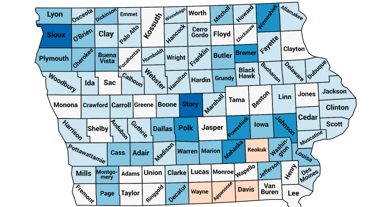 Several of the other counties with the biggest jumps are smaller, rural ones with college campuses: Winneshiek (Luther College), Poweshiek (Grinnell College) and Bremer (Wartburg College).
