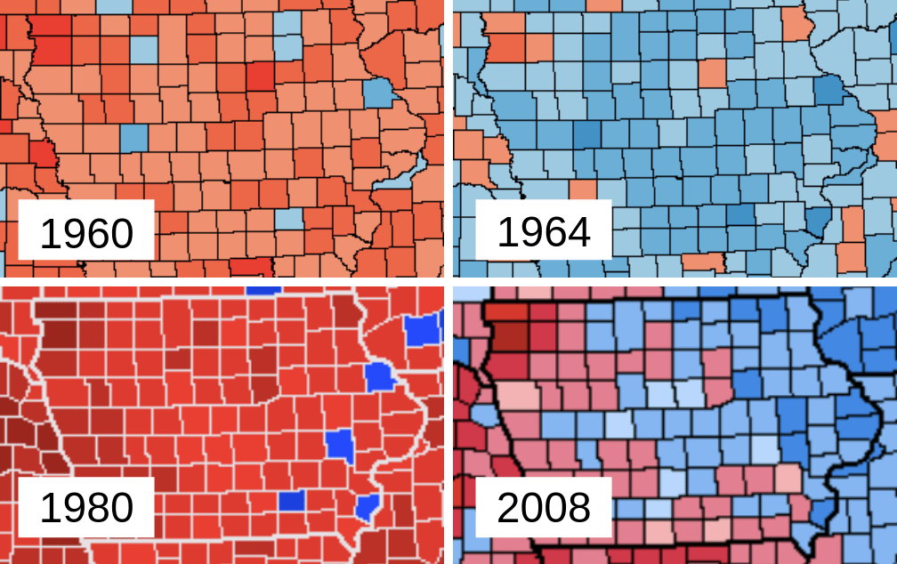 Dubuque County swung hard to the left for John Kennedy in 1960 and never looked back. The power of the Catholic Democrat vote here was immense. After voting 58% to 42% in favor of Dwight Eisenhower in 1956, it delivered a 63% to 37% vote for Kennedy in 1960, a full 42-point swing in favor of Democrats (for comparison’s sake, Trump’s 40-point swing in Northern Iowa’s Howard County was the largest in the entire country in 2016).
