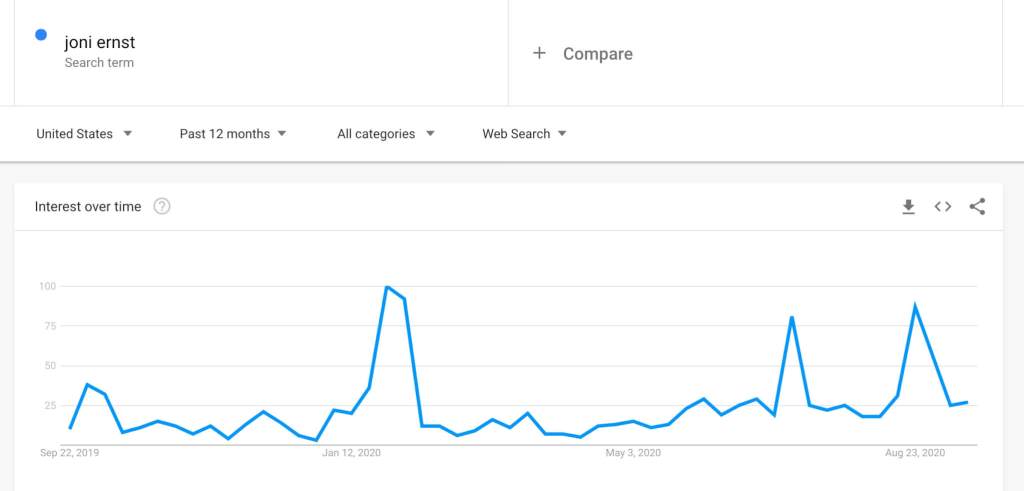 That moment blew up in Ernst’s face. The backlash online was fierce, and it drew national news as Ernst had given away Republicans’ plans. You can even measure how big it was. The last week of January remains today the biggest spike in Google searches for Ernst this year.