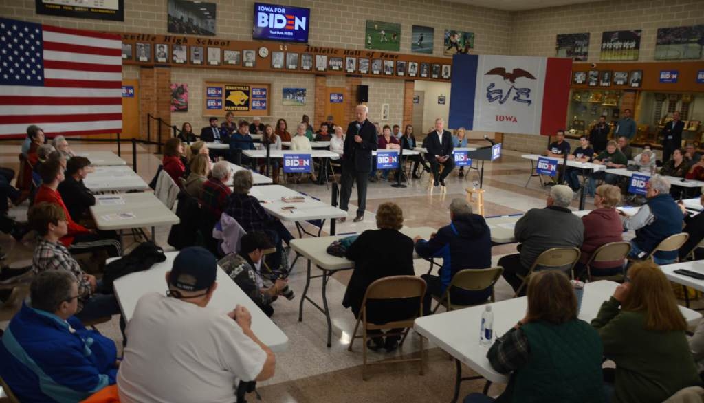At Biden’s Knoxville (population: 7,300) event, tables and chairs were set up to surround Biden in a square in the middle of a high school commons, letting him roam to all parts of the crowd, getting him at most three rows of chairs from any individual attendee. He often singled out a person in the crowd as he was making a specific point, looking them in their eyes and gesturing his hands at them.