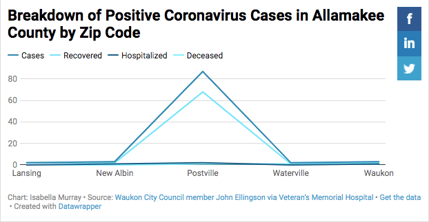 Postville, Iowa is confirmed to contain the vast majority of Allamakee County’s high number of coronavirus cases, according to new Veteran’s Memorial Hospital data uncovered by a local elected official.