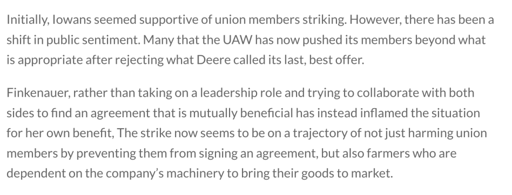 “The strike, and by extension Finkenauer’s support, has only exacerbated an already tough year for Deere, who was forced to stop taking orders for some models for next year due to production concerns and supply chain bottlenecks,” Field Report wrote. “Those production delays, now made even longer by the strike, could prove to be fatal to family farms.”