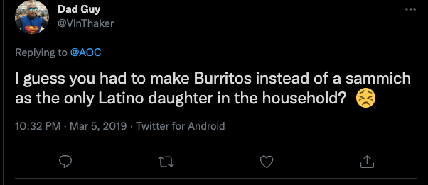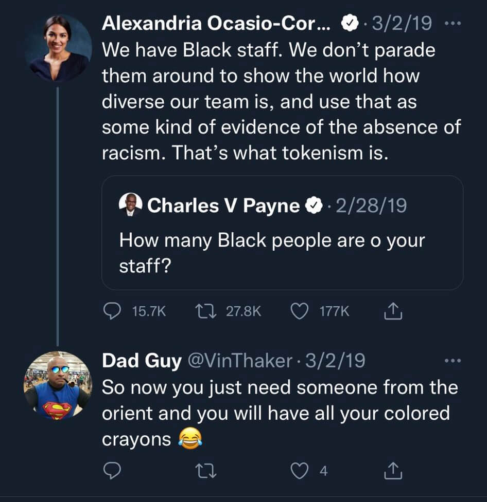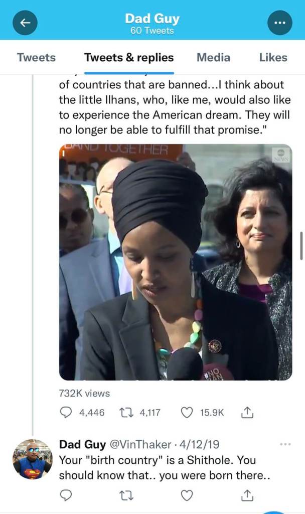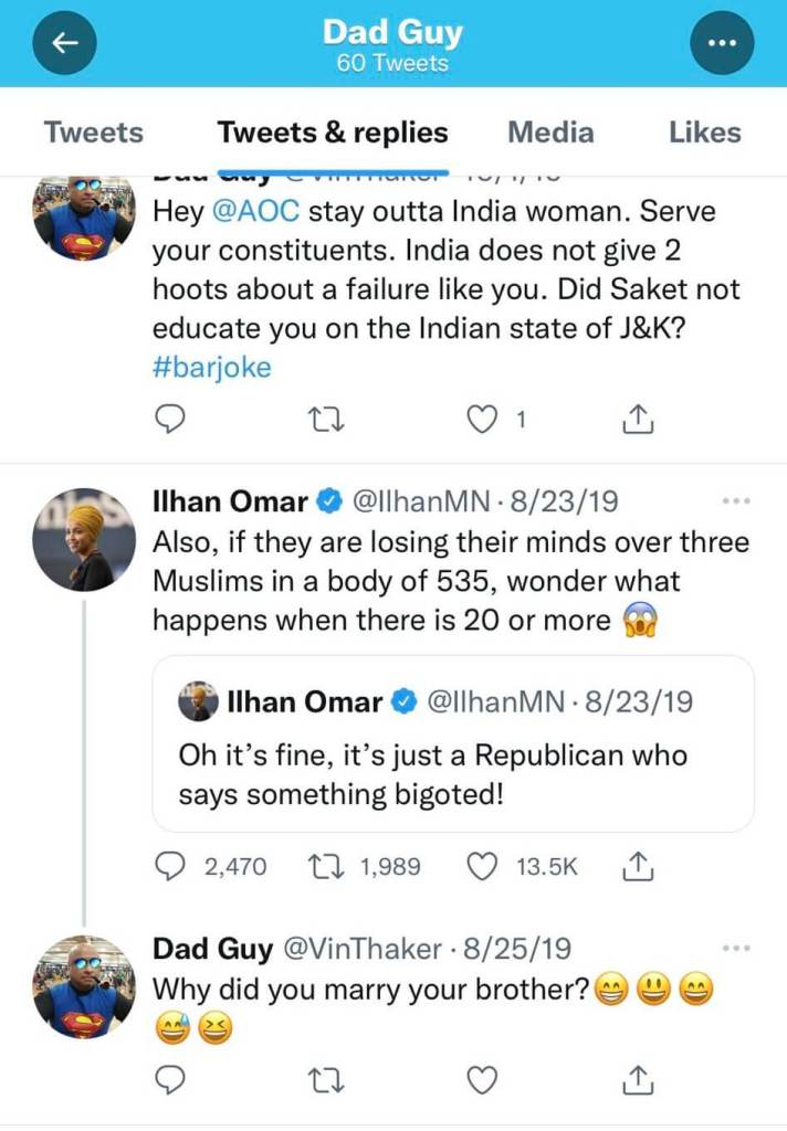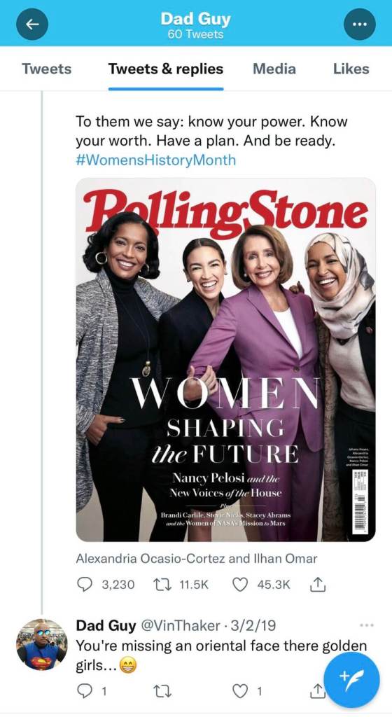 His frequent targets on Twitter were members of the progressive “Squad” in Congress, and Thaker often added in racist and sexist language in his rebuttals to their tweets, including occasionally using the word “oriental” to presumably refer to people of Asian descent.