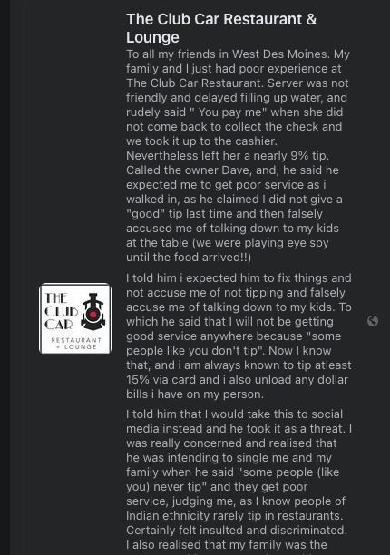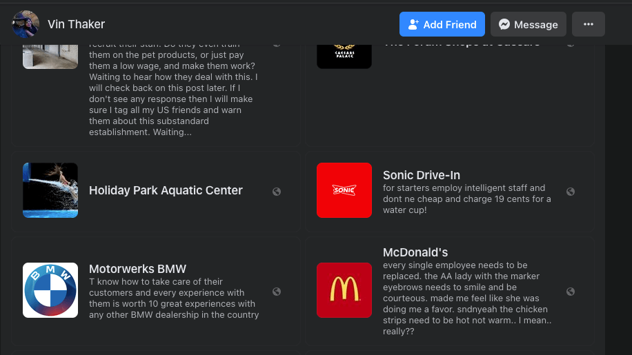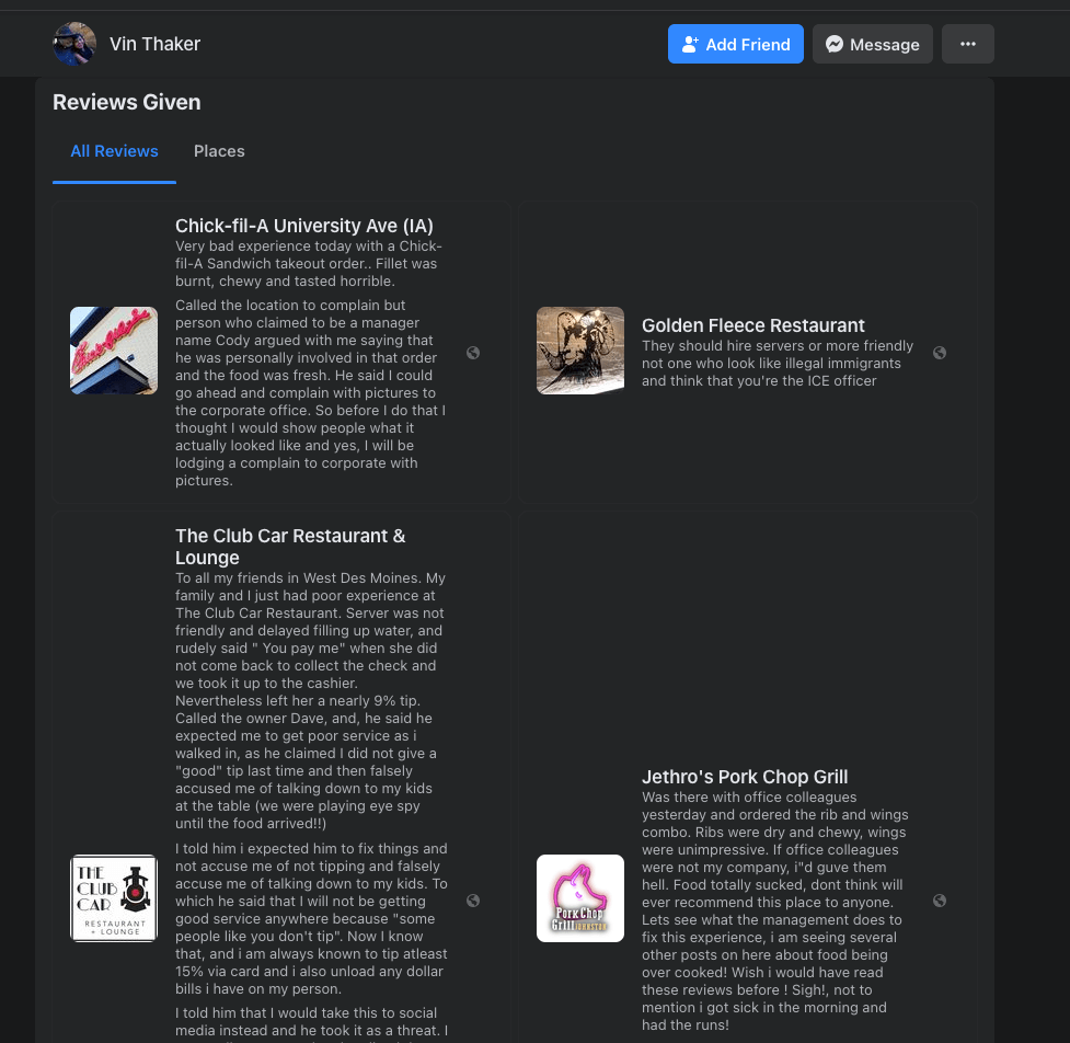 Finally, Thaker is also the kind of person who is often questioning how local businesses will “make it right” when service doesn’t live up to his or others’ expectations. Even in these reviews from his Facebook page (which have since been removed), Thaker inserts various racist and degrading rhetoric into his writing.