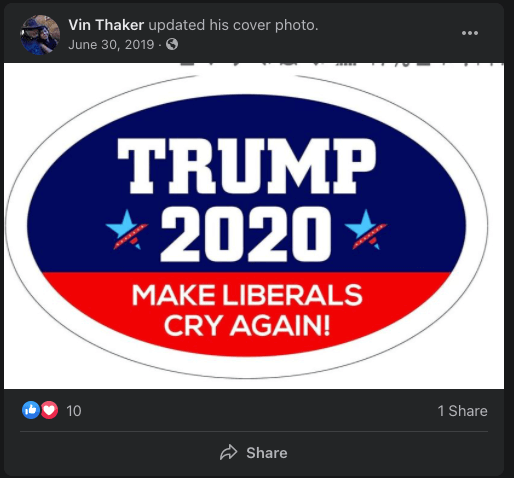 But Thaker’s history of posts show a clear trend of hyper-partisan, far-right and derogatory memes taking up a good portion of his online public persona in the years before he was a school board candidate.