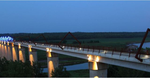 Rising 13 stories above central Iowa, this one-half mile pedestrian bridge spans the Des Moines River between Madrid and Woodward.