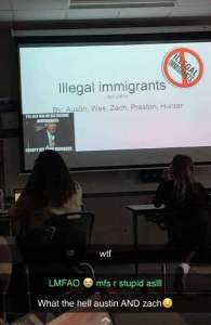 Some examples include a slide titled: “Why Illegals Should go home,” with one point claiming, “There is a huge influx of mexican rapists.” The presentation ended with, “In the end, Mexicans are bad.”