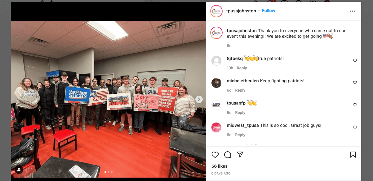 Turning Point’s Johnston chapter garnered local controversy when it launched an Instagram page that featured a number of photos some people found objectionable. One group photo featured a student holding a sign that says “No Matter What My Teacher Says I’ll Always Love America,” implying that Johnston teachers hate the country. This also comes at a time when Iowa politicians are introducing numerous bills targeting educators.