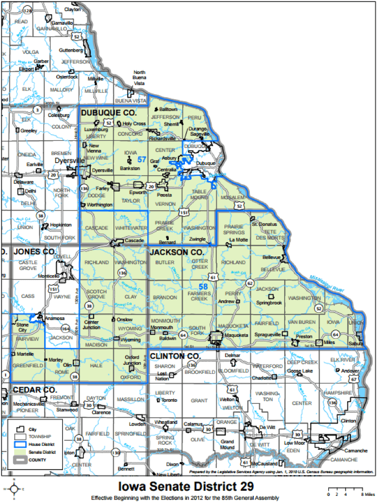 | Senate District 29 | D +9% | R +0% | R +0% | R +11% | R +1% | R +4% | Dubuque / Jackson / Jones Counties |