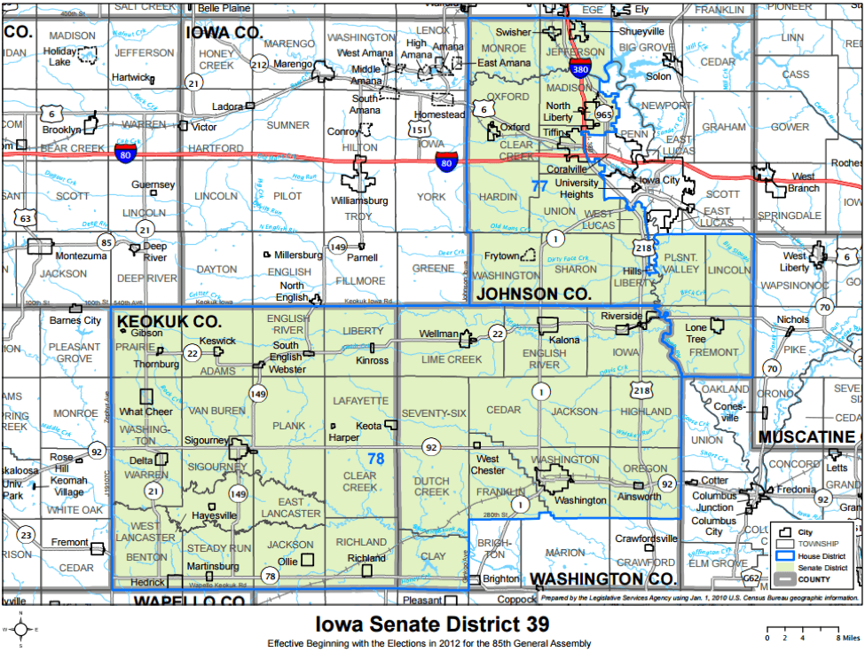 | Senate District 39 | D +5% | D +1% | D +2% | D +9% | D +4% | D +4% | Keokuk / Washington / Johnson Counties |
