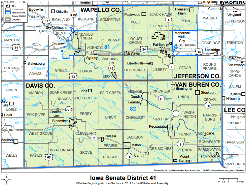 | Senate District 41 | R +2% | D +2% | D +5% | R +9% | R +1% | R +1% | Davis / Van Buren / Wapello / Jefferson Counties |