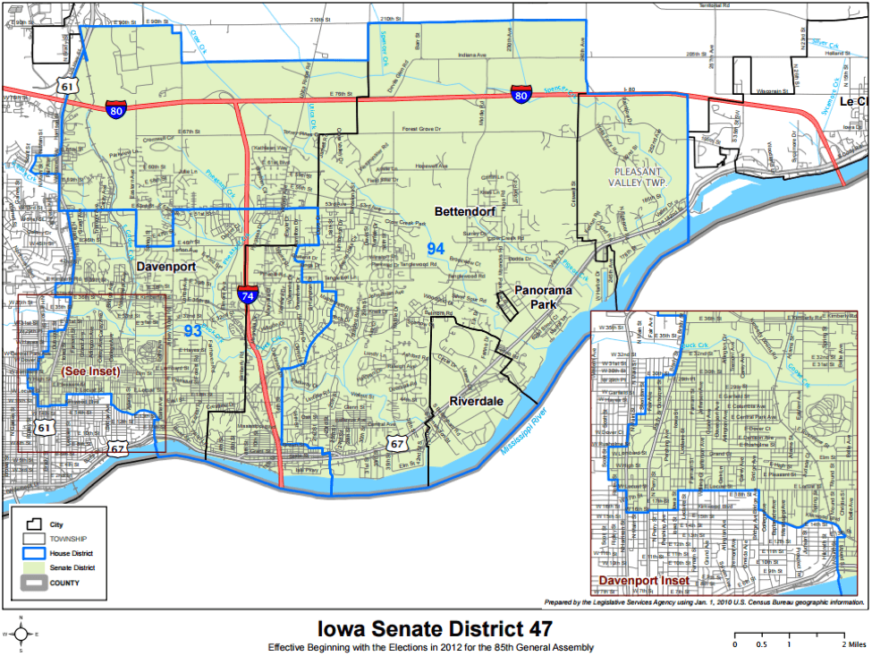 | Senate District 47 | R +13% | R +3% | R +9% | D +10% | R +4% | R +1% | Bettendorf / East Davenport |