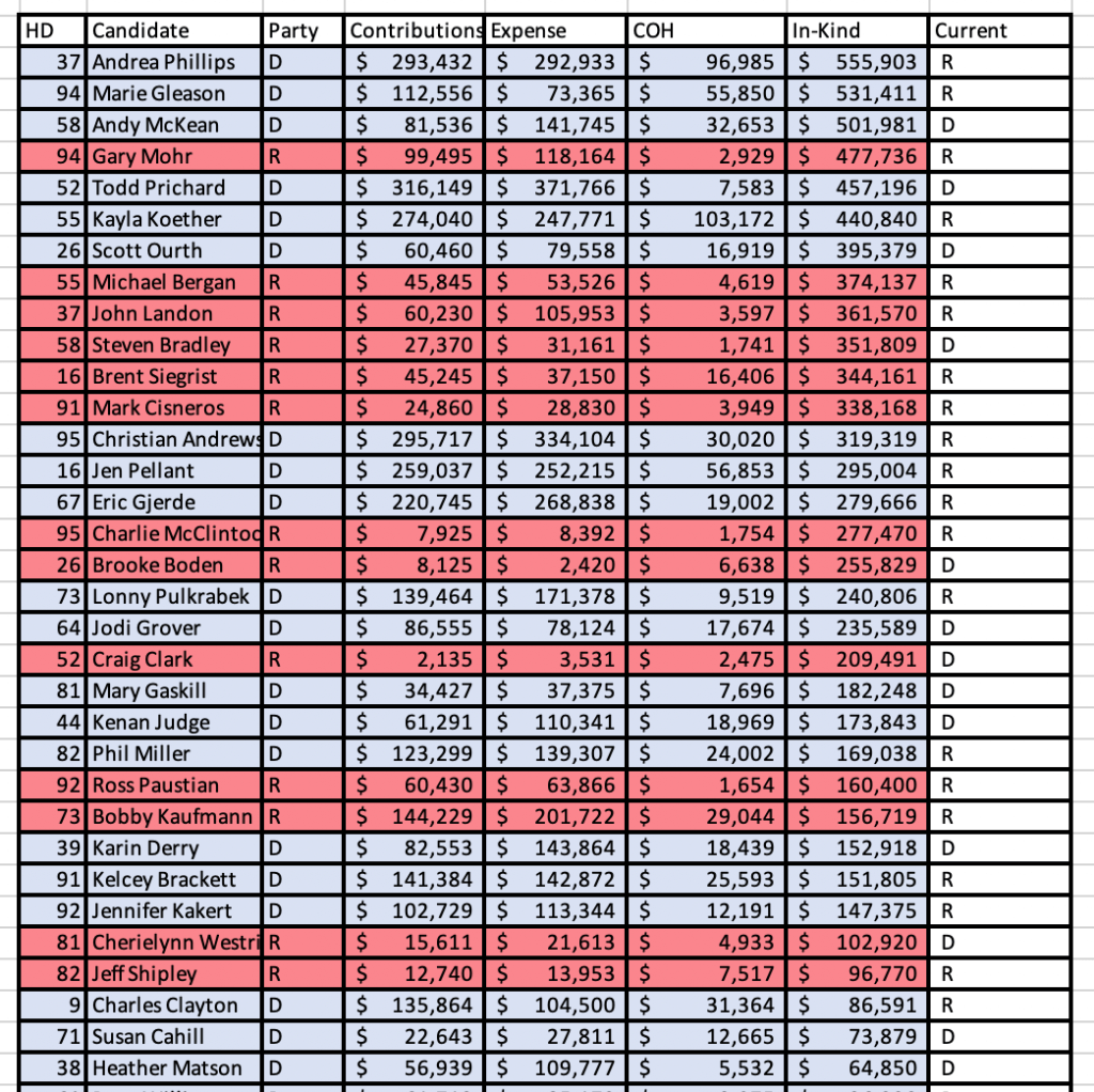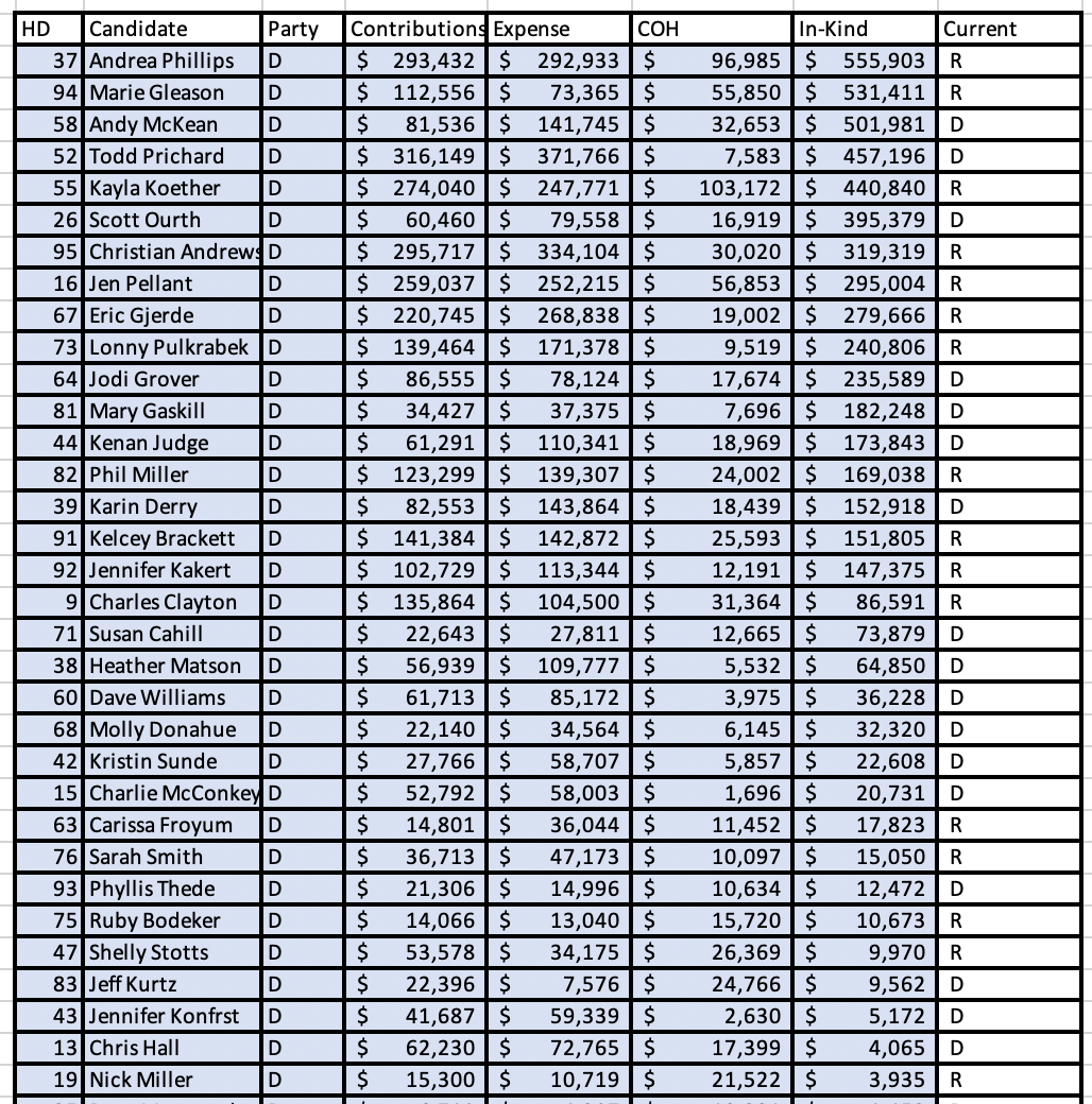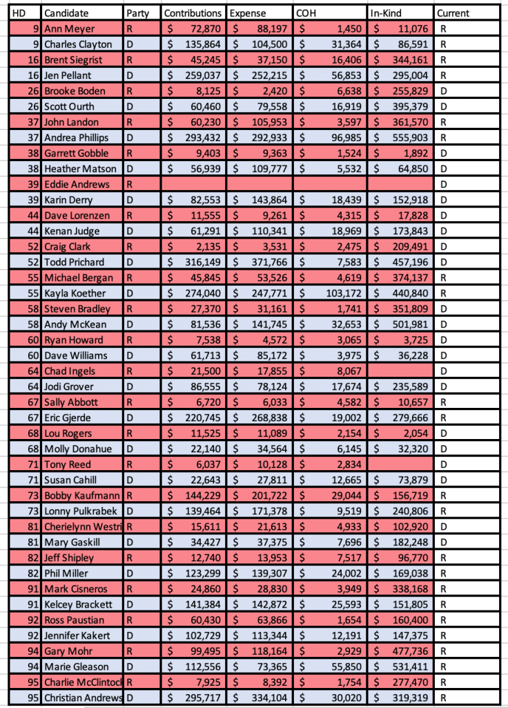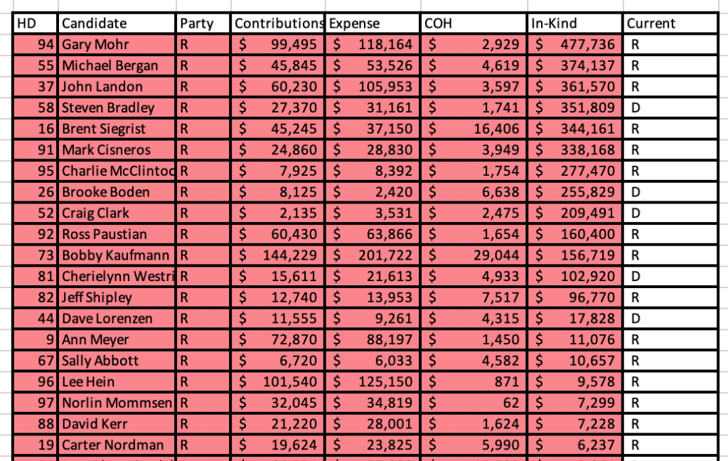 For Democrats, it’s the challenger candidates themselves that are bringing in the bulk of the money. While Democratic Leader Todd Prichard leads his caucus with $316,000, the non-incumbent candidates are posting eye-popping fundraising totals. Small dollar donations are fueling massive fundraising totals for first and second-time candidates, those who don’t have near the number of connections as incumbent legislators.