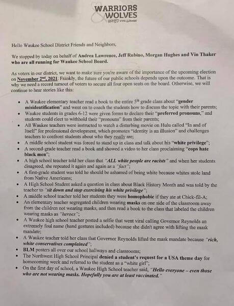 The Waukee candidates may also have gone overboard in how they campaigned on the issue. Under their Warriors and Wolves banner, the candidates and their supporters distributed a two-page flier that made direct attacks against teachers and district personnel. It did not include citations (their website had some instead), and critics pointed out that many of them were essentially rumors from anonymous sources or significant misrepresentations of what really happened in the schools.
