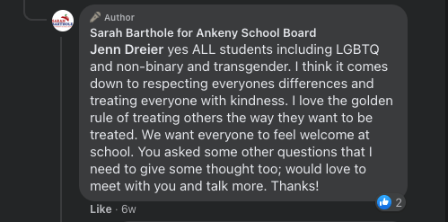 Burk, on her campaign page, noted she did not think she would have been endorsed by Ankeny’s Iowa State Education Association chapter if she didn’t support the LGTBQ community.