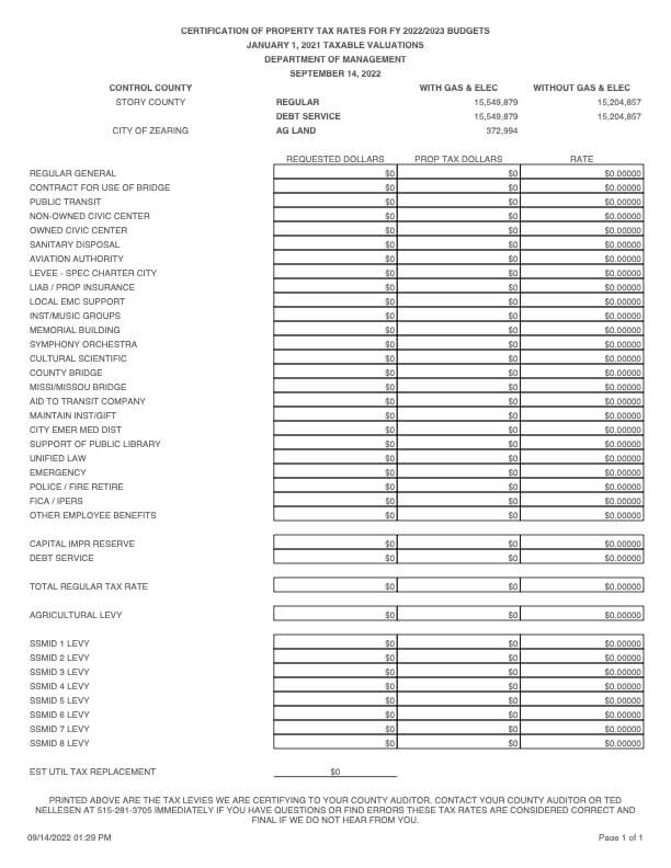 The reason Zearing residents are getting a property tax-free year is that Zearing officials failed to get the city’s budget approved and certified through the Iowa Department of Management and Story County Auditor’s Office by the March 31 official deadline. They’re one of two towns in the entire state to fail to do so this fiscal year.